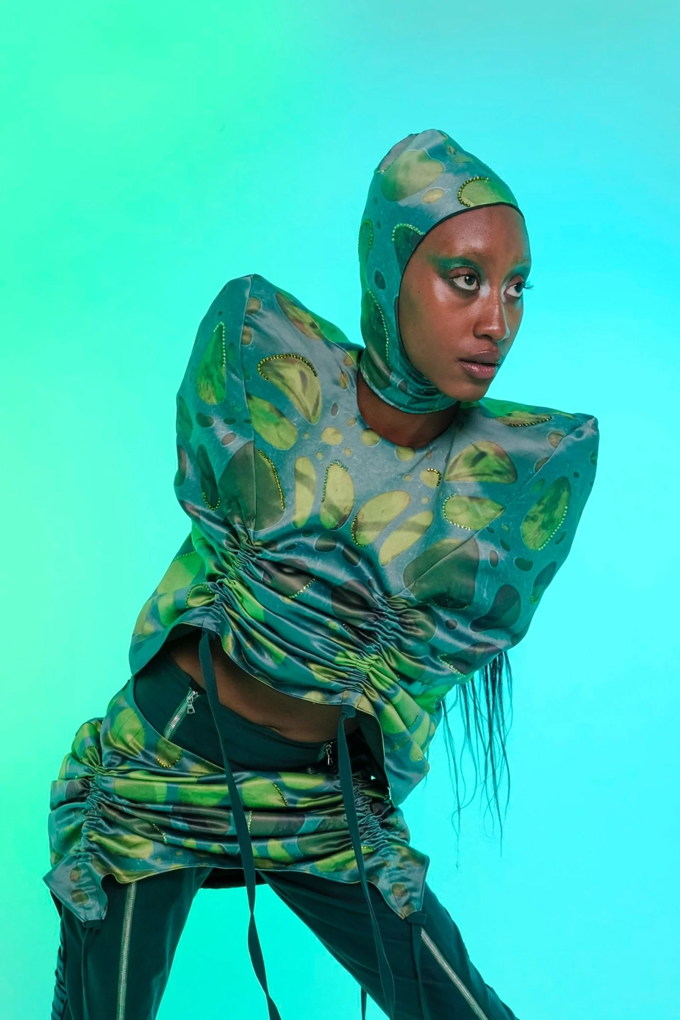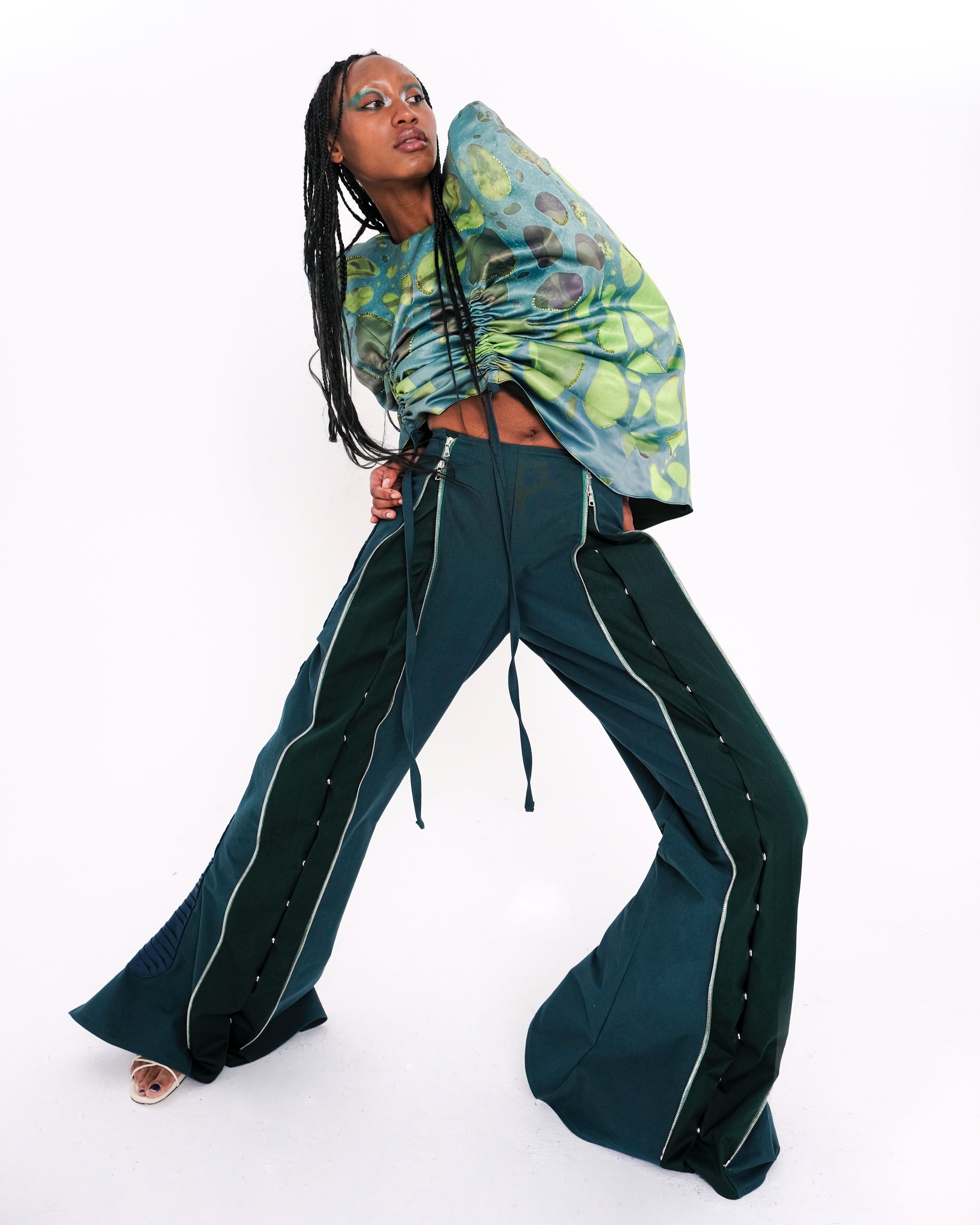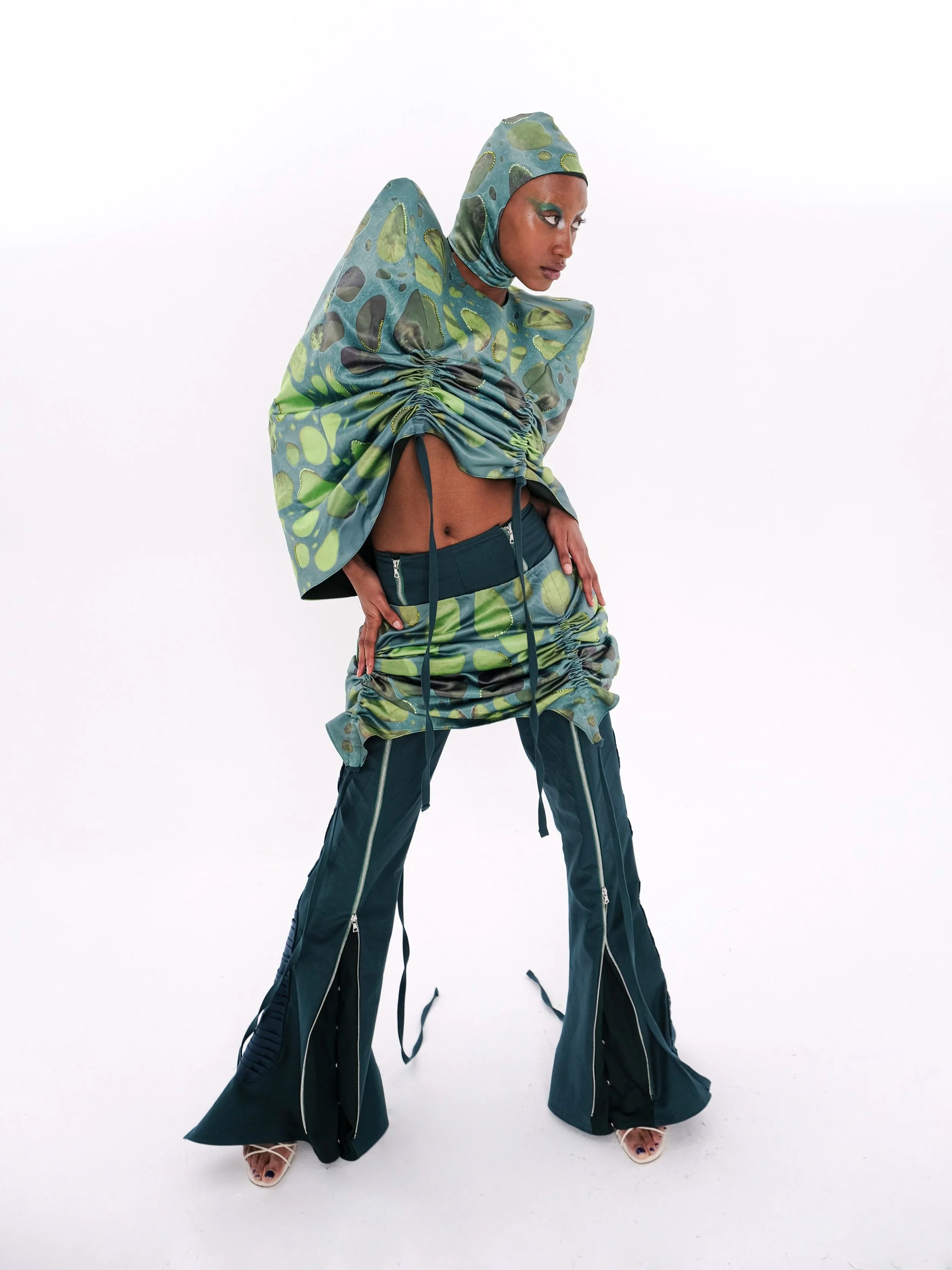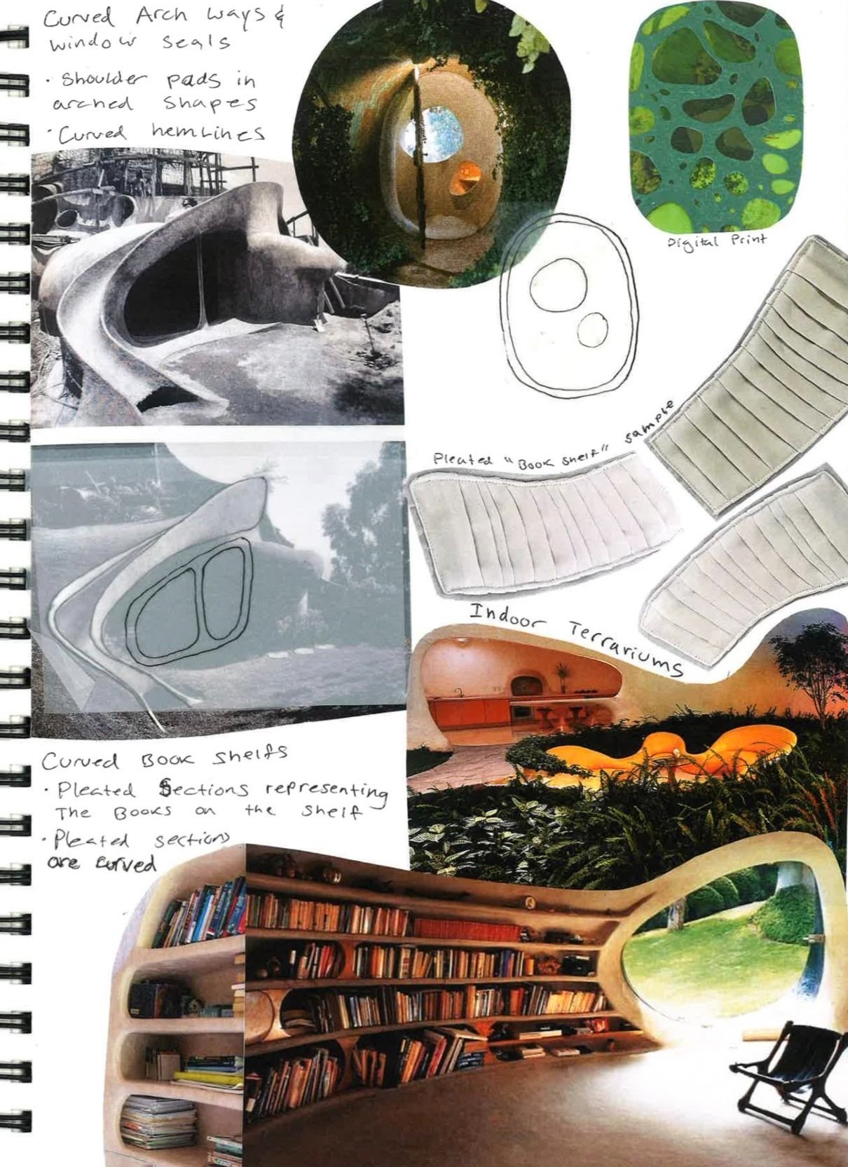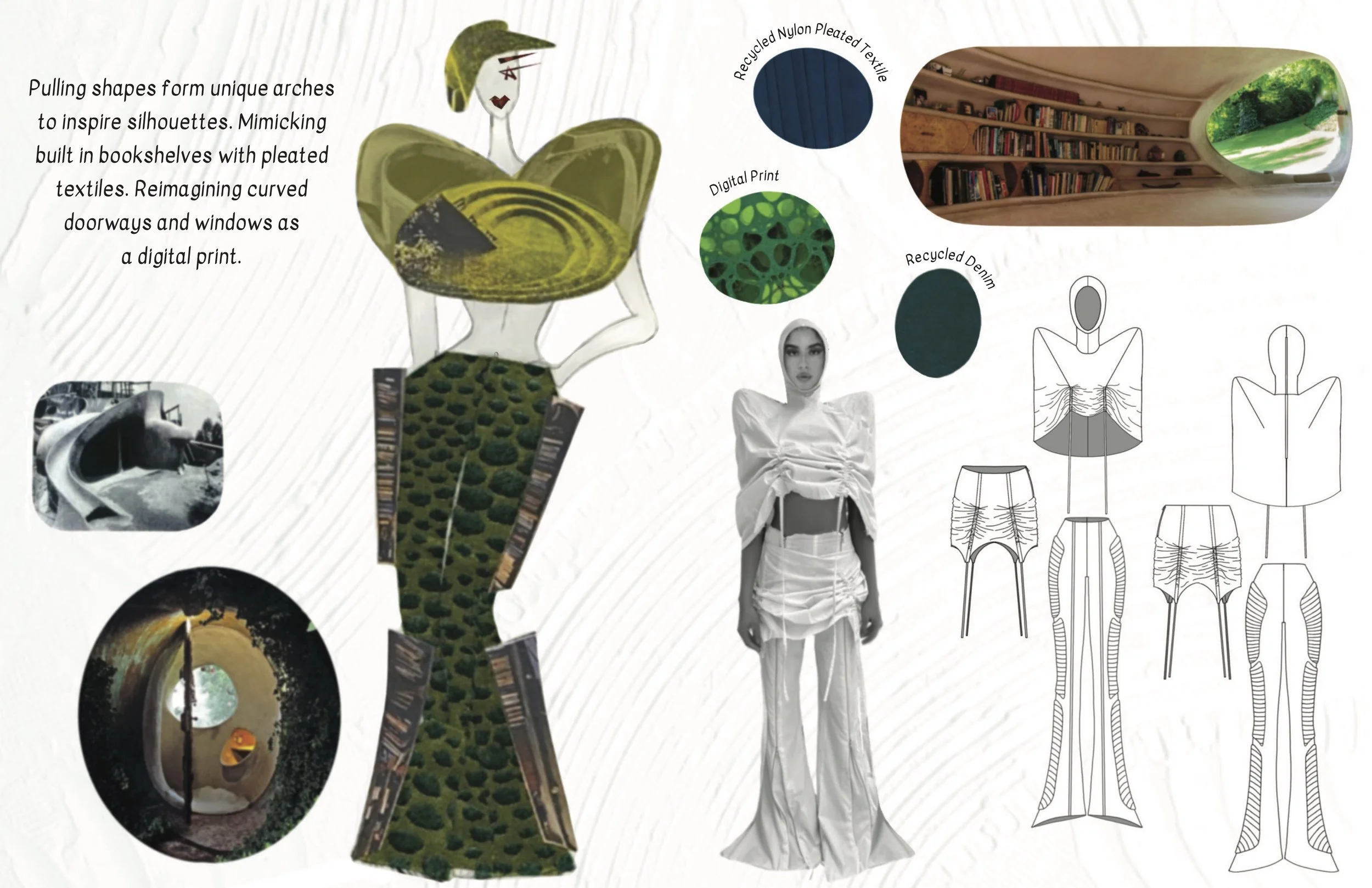 — The ensemble is made up of three garments. Two are created with a digital print developed from images of windows framing indoor and outdoor landscaping seen in Javier Senosiain’s homes. The pants are constructed from recycled denim and nylon, pleated into decorative panels representing the spines of books sitting on the built in bookshelves. The pants are designed with zippers and snaps giving them the ability to become three unique pant and skirt silhouettes.
